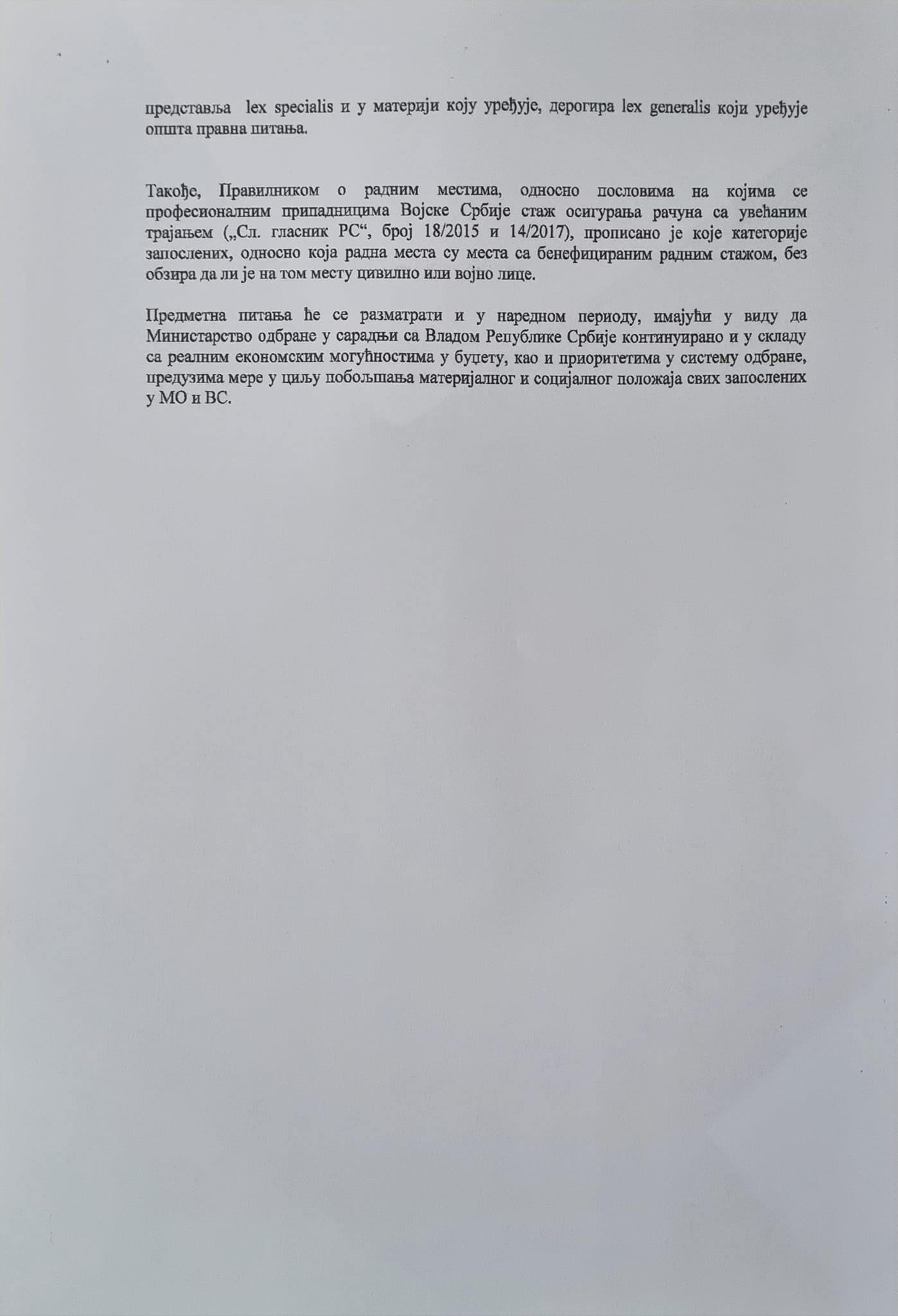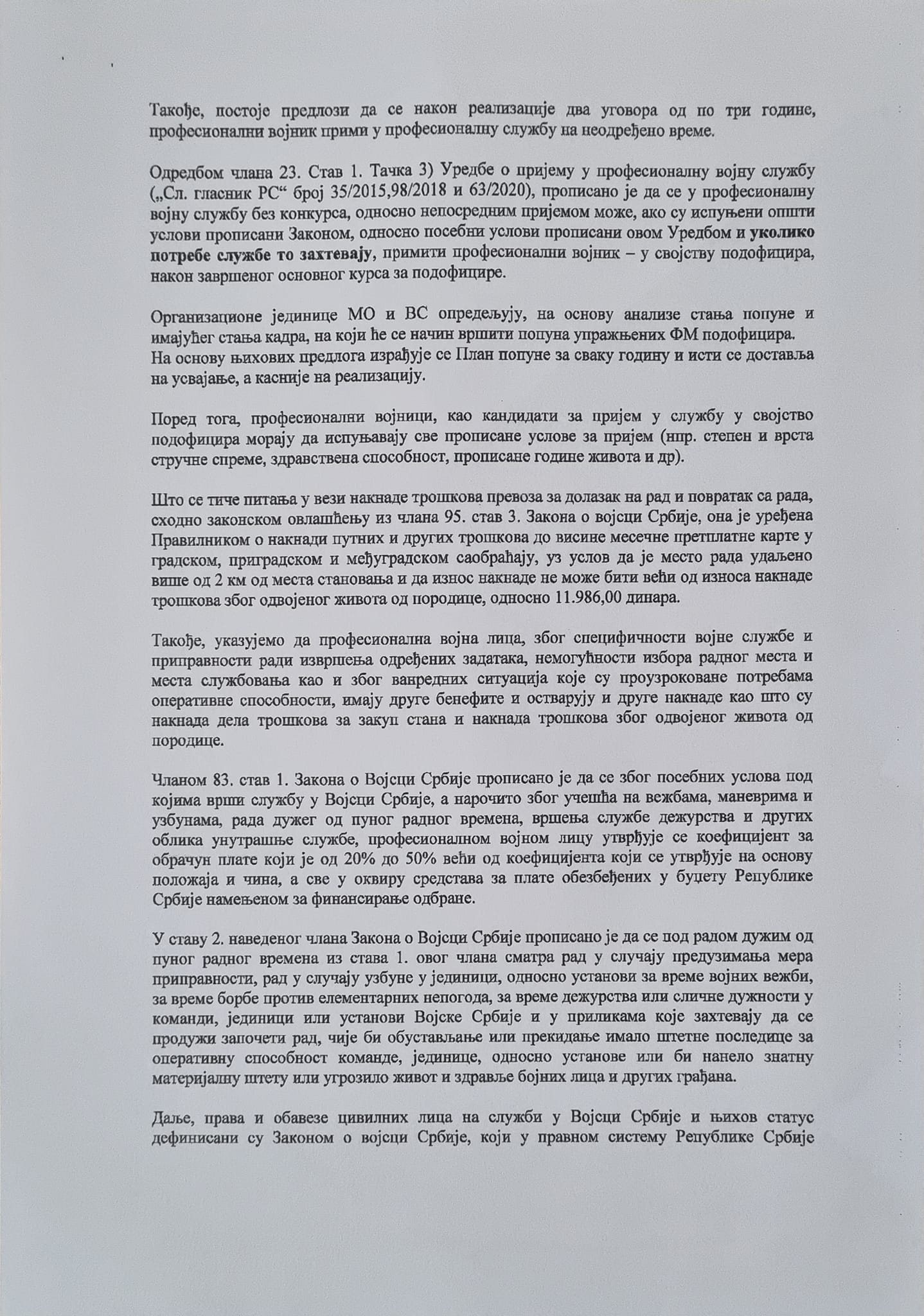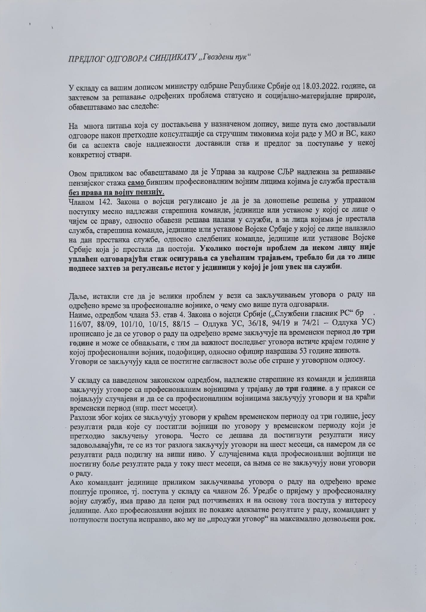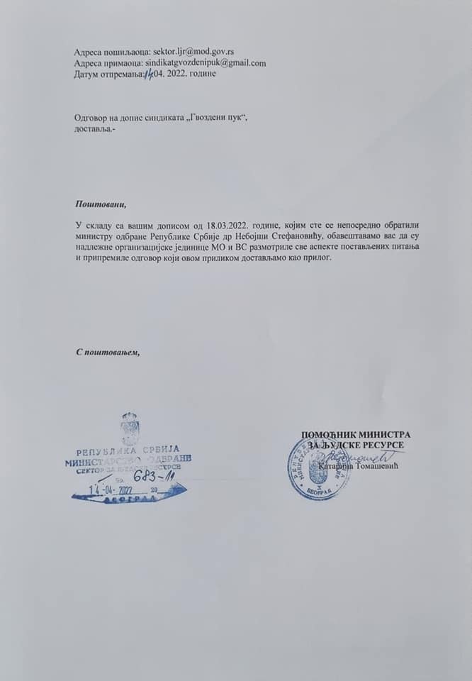 Добили смо одговор од Министарства одбране на наш допис од 18.03.2022.године. У одговору су нам цитирали чланове Закона, уредбе и правилнике са којима смо ми већ добро упознати. Да су ти правилници и уредбе повољни по запослене ми им се не би ни жалили. Помињу се додаци на плату, које имају запослени у МО и ВС а због којих их не следују принадлежности попут ноћног, празничног, прековременог рада…Лепо је истицати то све али плата запослених у МО и ВС се и састоји само од додатака, основица је толико мала да би без тих додатака била мања од минималца . Наш синдикат ће покренути једну озбиљну борбу на свим нивоима за опстанак српског војника и радна права достојна запосленог човека у 21.веку. Сматрамо да представник послодавца мора озбиљно да схвати речи синдиката јер су то речи запослених које он представља.
